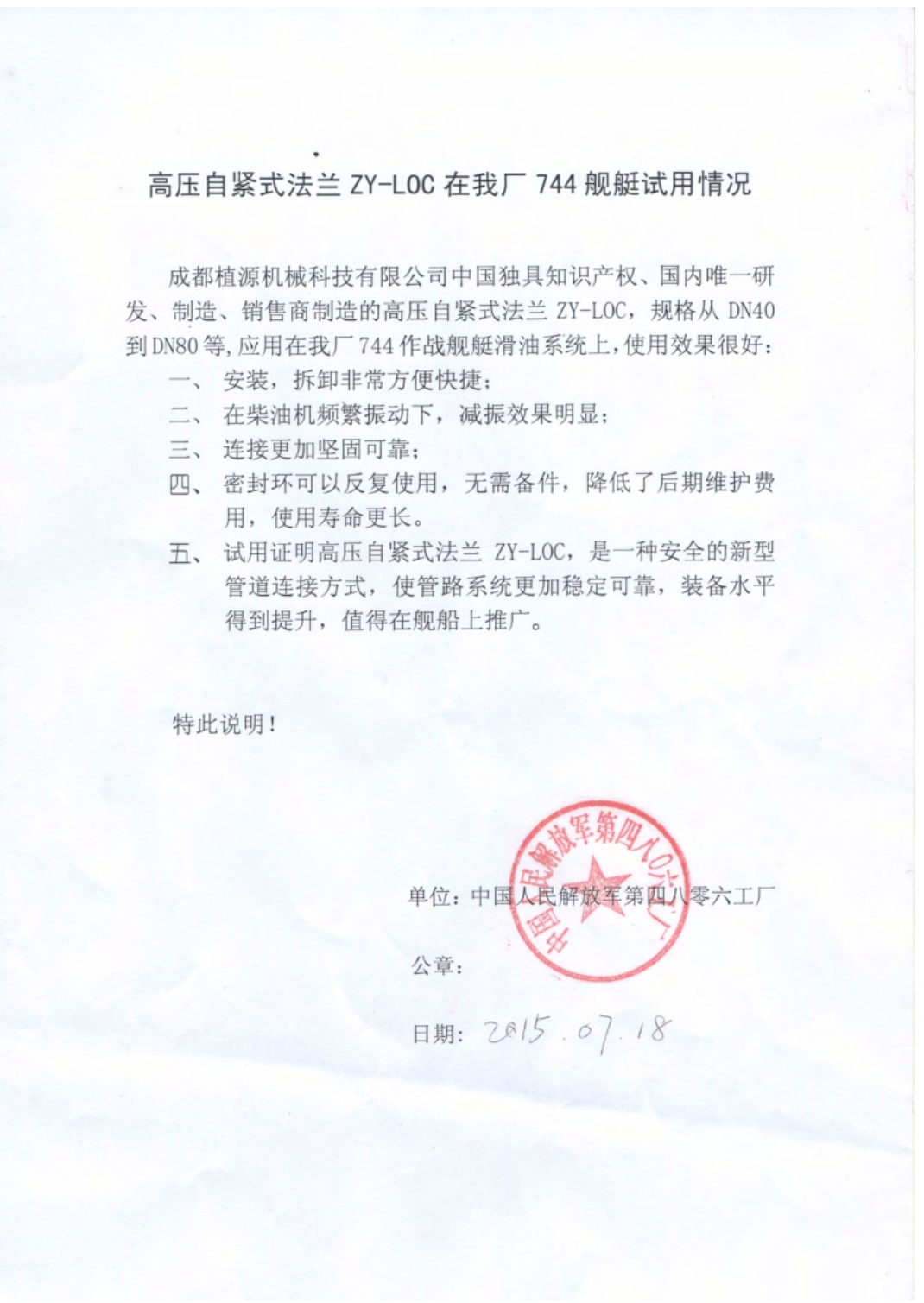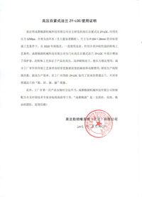 中國人民解放軍第四八零六工廠(chǎng)使用證明