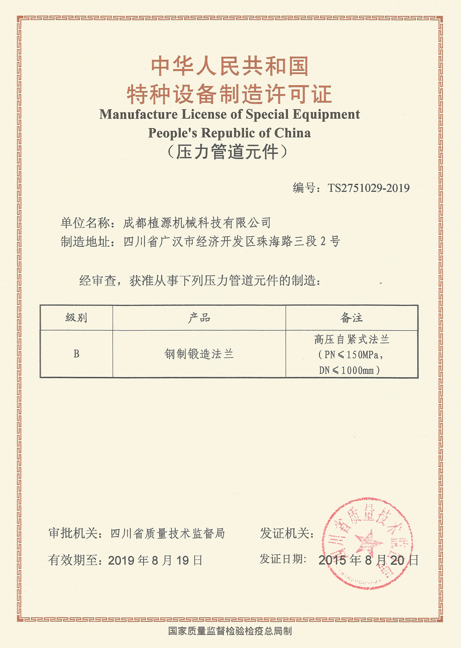 2015年7月4日—5日,四川省質(zhì)量技術(shù)監督局派出專(zhuān)家,組成評審組,對我司高壓自緊式法蘭ZY-LOC特種設備制造許可證換證、增項進(jìn)行了現場(chǎng)評審鑒定。最終,我司通過(guò)評審,繼續獲得B級壓力管道元件制造許可證,制造范圍增至:PN≤150MPa,DN≤1000mm。